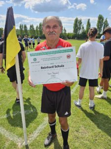 Ein echtes Highlight war die Ehrung von Schiedsrichter Reinhard Schulz, der für seine langjährige und engagierte Arbeit und seine besonderen Verdienste, in den exklusiven DFB-Club 100 aufgenommen wurde – eine besondere Auszeichnung für herausragendes ehrenamtliches Engagement im Fußball.